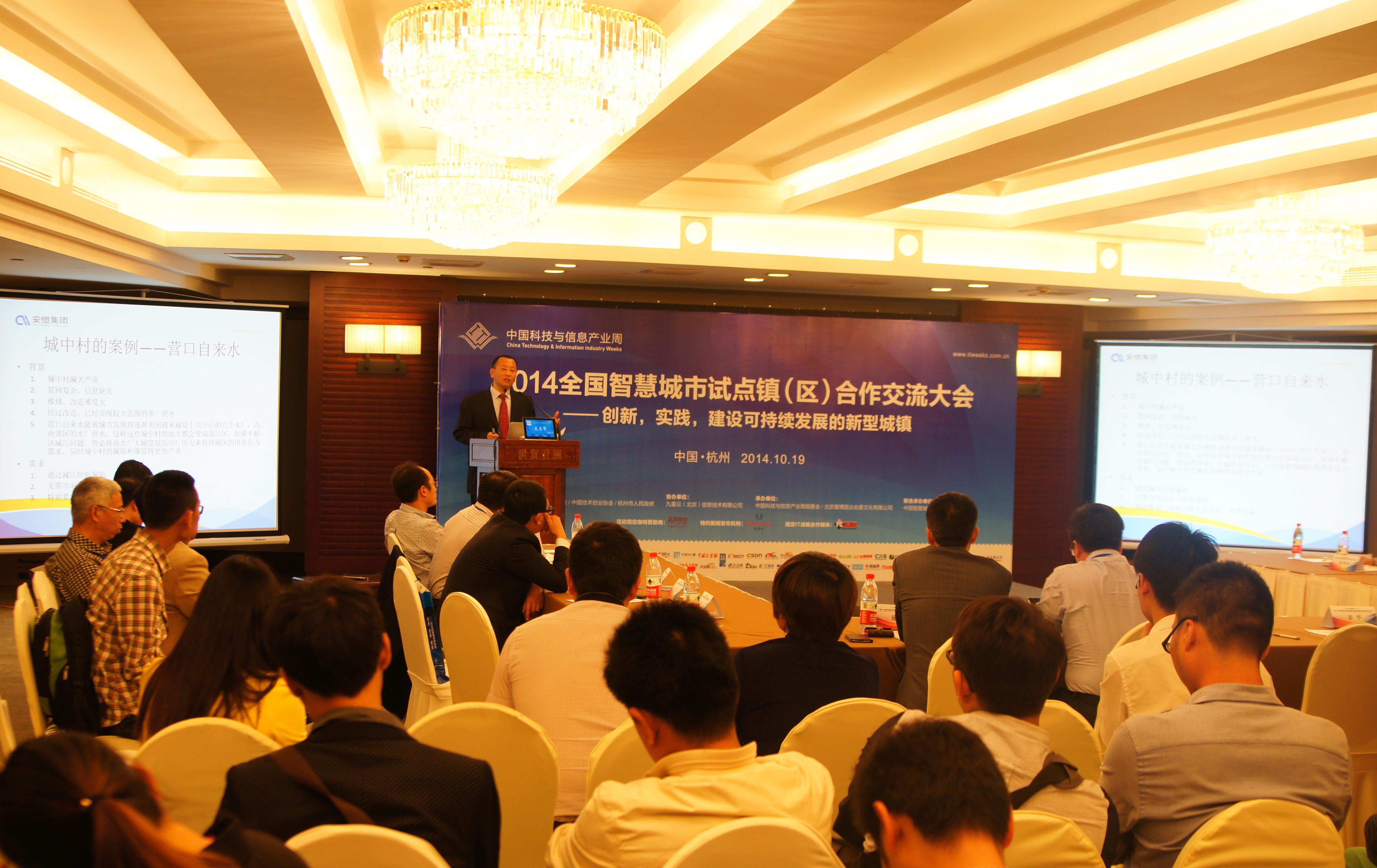 近日,安恒集团应邀参加“2014中国智慧城市试点镇(区)合作交流大会”,王志军副总裁将安恒集团在智慧水务领域取得的突破进展和水联网® 及其智慧化精细水管理基础平台的应用成果分享给参加本次大会的各级领导、专家学者和智慧城市领域的各界精英。期间,安恒集团自主研发的水联网®管网漏损控制系统解决方案的应用案例引起与会各界的强烈反响和关注。
